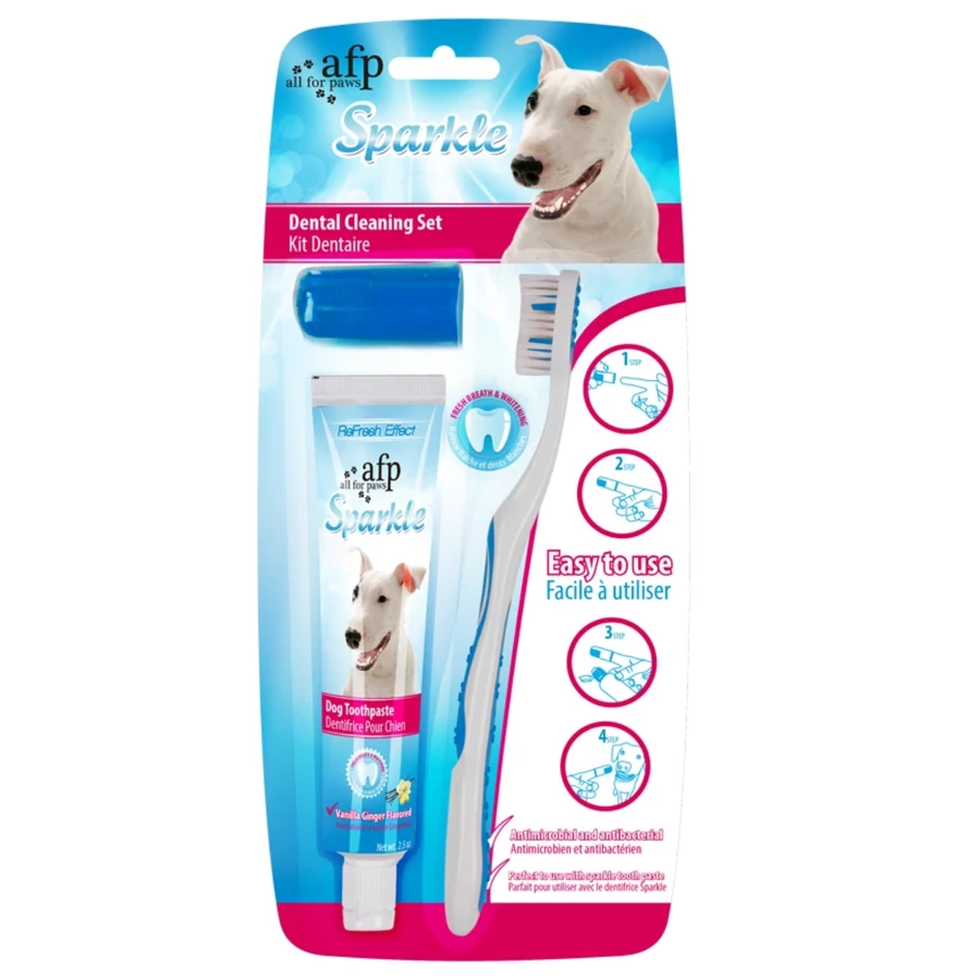 Az AFP Sparkle fogápoló készlet mindent tartalmaz, amire szüksége van kutyája szájhigiéniájának megőrzéséhez. A készlet egy 57 g-os vanília és gyömbér ízesítésű fogkrémet, egy hagyományos fogkefét és egy ujjas fogkefét tartalmaz. A fogkrém szódabikarbónát tartalmaz, amely hatékonyan tisztítja a fogakat, eltávolítja a lepedéket és friss leheletet biztosít. A különböző kefék lehetővé teszik a kutya szájának minden területének alapos tisztítását, megkönnyítve ezzel a fogápolást.