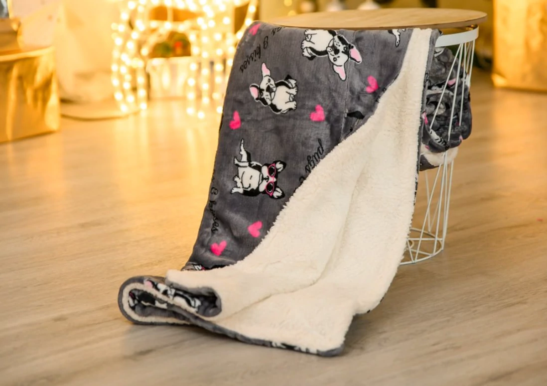 A pléd egyik oldala mikroplüss anyagból (szürke francia bulldog mintás), másik oldala fehér bárány bunda utánzatból készült.