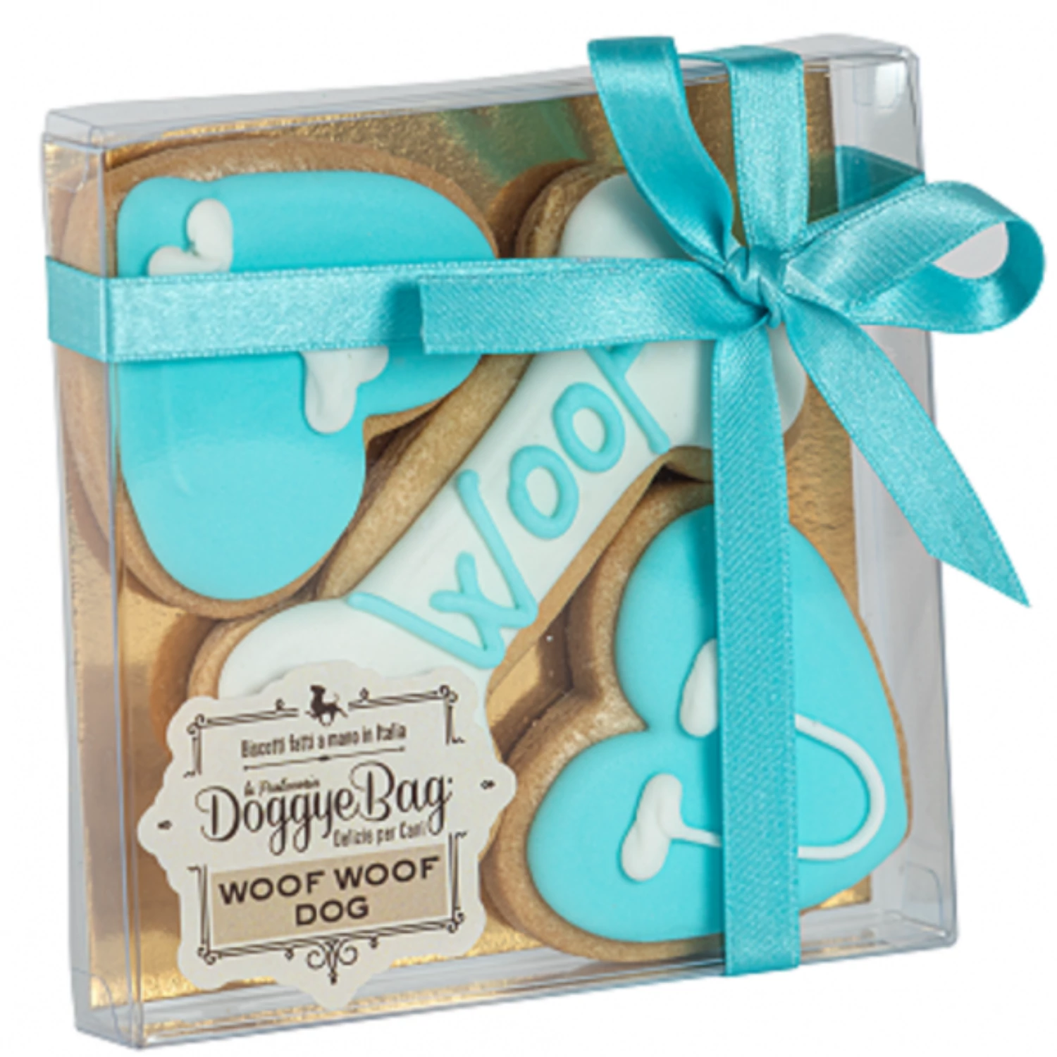A Woof Woof Dog csomag, különleges, szív és csont formájú kekszeket tartalmaz, amelyeket finom,kék színű joghurtos máz borít. Ropogós állaga és vidám megjelenése tökéletes választássá teszi születésnapra, ajándékba vagy bármilyen alkalomra, amikor egy kis extra kényeztetés jár a kutyusnak.