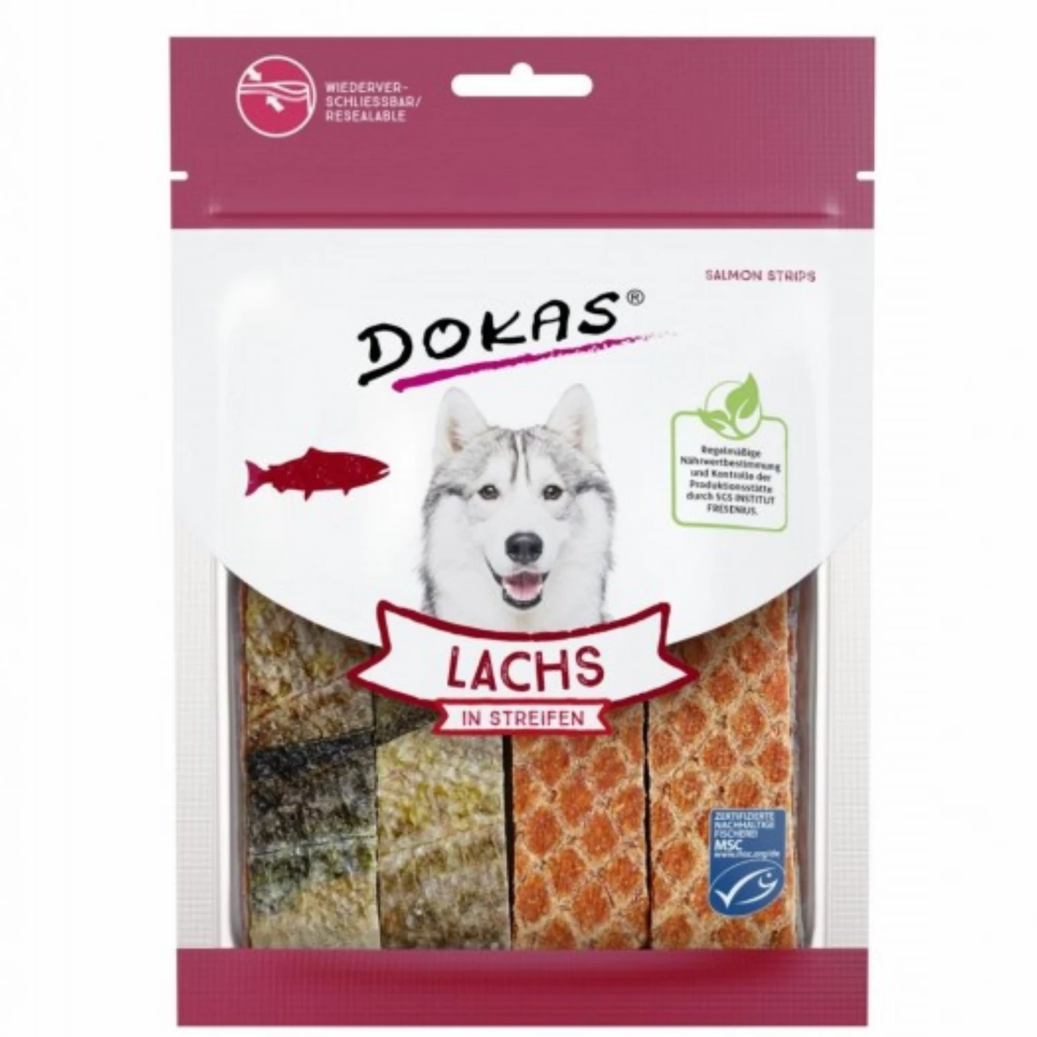 A Dokas szárított lazac csíkok természetes és ízletes jutalomfalatok, amelyek gazdagok omega-3 zsírsavakban, így támogatják a fényes szőrzetet, az egészséges bőrt és az immunrendszert. A magas lazactartalom kiváló fehérjeforrás, amely minden korú és méretű kutyának tökéletes választás.