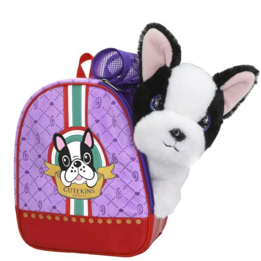 A készlet tartalma egy francia bulldog plüss és egy háti táska.