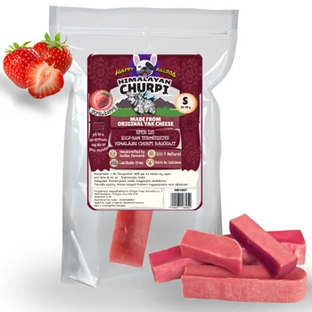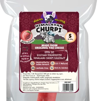 Fedezd fel a Himalája titkát minden egyes harapásban egyedülálló epres ízesítéssel! Ez a különleges sajttípus, melyet a világ legkeményebb sajtjaként is tartanak számon, eredetileg Nepálból és Indiából (a Himalája lábától) ered . A legtöbb hazánkban kapható hasonló churpi sajttal ellentétben a miénk valóban indiából származik, így nem európai tehén tejből, hanem indiai jak és zebu tejből készült. Ebből kifolyólag sokkal kevésbé allergizál, és nem tartalmaz semmilyen állattartásól és nevelésből származó hormonokat vagy adalékanyagokat sem. Összetevői – 98% jaktej és zebu tej, eper, egy csipetnyi lime lé és egy kevés só – tökéletes harmóniát alkotnak, így nyújtva egyedülálló, autentikus ízélményt. Ízesítés: eper ízesítés Súly: 25-40 gramm Kiszerelés: 1 db Származási hely: India Bár prémium minőségű, árát tekintve is meglepően kedvező, hiszen a terméket közvetlenül a készítőtől szerezzük be, mellőzve a bonyolult kereskedelmi láncokat. A Churpi rudak egyszerűen ellenállhatatlanok minden kutya számára – nemcsak ízletesek, de tápláló összetevőik révén számos fontos egészségügyi előnnyel járnak, melyek hozzájárulnak kedvenced vitalitásához és jó közérzetéhez: