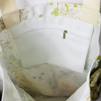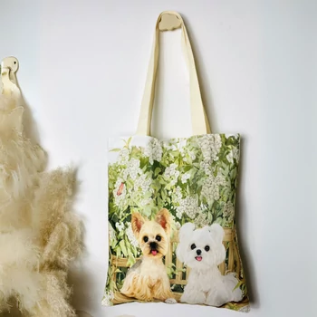 Ez a nagyméretű kutyás vászontáska egyszerre bájos és praktikus. Előlapján egy aranyos Yorkshire terrier és egy hófehér bichon frisé látható egy virágos háttér előtt – garantáltan mosolyt csal minden kutyabarát arcára! Strapabíró, 100% poliészter anyagból készült, így ideális nagybevásárláshoz, kutyasétáltatáshoz vagy akár ajándéknak is. Belseje egyterű, emellett egy cipzáros zseb is segíti a rendszerezést. A világos színű pánt kényelmesen vállra vehető, a táska pedig könnyen tisztán tartható. Termékjellemzők: