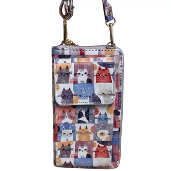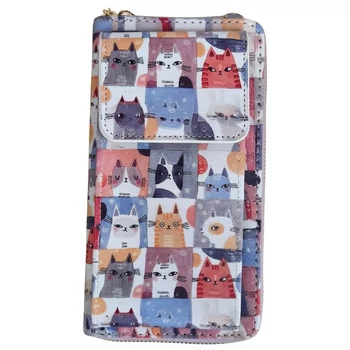 Ez a vidám és egyedi megjelenésű pénztárca tökéletes választás a macskabarátok számára. A pasztell színű, négyzetrácsos elrendezésben megjelenő különböző cicafejek kedves, játékos stílust kölcsönöznek a praktikus kiegészítőnek. A pénztárca, telefontartó és mini táska funkciókat ötvöző darab ideális a mindennapi használatra. A cipzáras főrekesz belsejében négy kártyatartó, két papírpénztartó zseb, valamint egy külön cipzáras aprótartó is helyet kapott. A telefon számára kialakított külön rekesz patentos záródással rendelkezik, amely megkönnyíti a hozzáférést, miközben biztonságosan tartja a készüléket. A termék levehető, állítható pánttal érkezik, amelynek maximális hossza 27 cm, így nyakban vagy vállon is kényelmesen viselhető. A telefontartó rekesz mérete 17 x 8 x 3 cm, amely a legtöbb általános méretű okostelefonhoz megfelelő (például iPhone 14 vagy Samsung Galaxy A-széria). Nagyobb tokos készülékeknél javasolt a méretek előzetes ellenőrzése. Termékjellemzők: