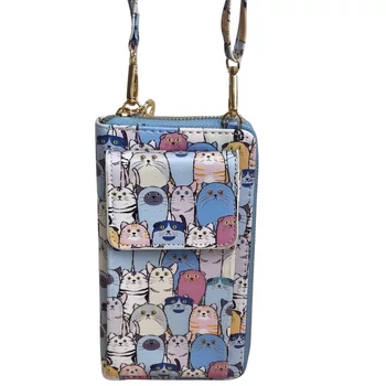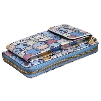 Ez a pasztell árnyalatú, világoskék alapon cicás mintával díszített pénztárca tökéletes kiegészítő minden macskakedvelő számára. A játékos és vidám cicafejek modern, mégis bájos megjelenést kölcsönöznek ennek a praktikus, többfunkciós darabnak, amely pénztárcaként, telefontartóként és mini táskaként is remekül használható. A cipzáras pénztárca belső része négy kártyatartóval, két nagyméretű papírpénztartó zsebbel és egy cipzáras aprópénztartóval van felszerelve. A telefon külön rekeszben, patentos zárással tárolható, így egyszerre biztonságos és könnyen hozzáférhető. A tartozék levehető, állítható hosszúságú pánt maximális hossza 27 cm, így a pénztárca nyakban vagy vállon is kényelmesen viselhető – ideális sétához, utazáshoz vagy vásárláshoz. A telefontartó mérete 17 x 8 x 3 cm, amely a legtöbb normál méretű okostelefonhoz alkalmas (pl. iPhone 14, Samsung Galaxy A-széria). Vastagabb tok esetén ajánlott előzetesen ellenőrizni a méretet. Termékjellemzők:
