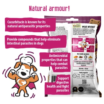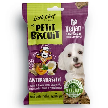 A Little Chef ANTIPARASITIC egy természetes védelmet nyújtó, ízletes funkcionális snack, amely segíti kutyád szervezetét a belső és külső élősködők elleni védekezésben. Kis adagokban, kíméletesen sütött falatok kizárólag szuperélelmiszerekből, emberi fogyasztásra is alkalmas, természetes összetevőkből. Gabonamentes, vegán és hipoallergén – érzékeny kutyák számára is kiváló választás. A kömény, szezámmag, kókuszolaj, petrezselyem, édeskömény és tökmag ereje egyesül ebben a receptben, hogy kutyád természetes módon vehesse fel a harcot a paraziták ellen! Ajánlott kölyökkutyáknak 4 hónapos kortól. Miért hasznos ez a snack?Természetes védelem: A tökmagban található cucurbitacin természetes parazitaellenes hatással bír Összetevők:Csicseriborsó, szárított burgonyapép, lenmag, szezámmag (10%), tök liszt, édesburgonya (8%), lenmagpogácsa, karobpor (5%), hidegen sajtolt kókuszolaj (3%), kömény (2%), inulin (0,5%), fodros petrezselyem (0,5%), édesköménymag (0,5%), nátrium-hidrogén-karbonát, sörélesztő (0,2%), tökmag (0,1%) Analitikai összetevők:Keményítő: 32%