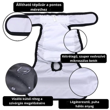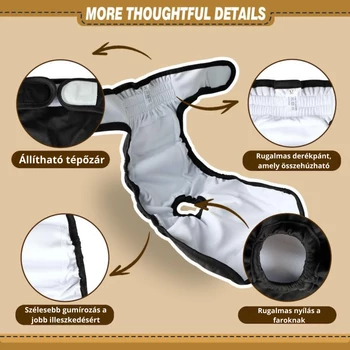 A mosható kutyapelenka és tüzelőbugyi ideális megoldás minden szuka kutya számára, aki tüzelési időszakban van, hajlamos a vizeletszivárgásra, vagy műtét után fokozott higiéniai védelemre van szüksége. Kényelmes, biztonságos és higiénikus használatot biztosít otthon, utazás közben vagy állatorvosi beavatkozást követően. A többször használható kialakítás gazdaságos és környezetbarát alternatívát nyújt az eldobható bugyikkal szemben. Főbb jellemzők: