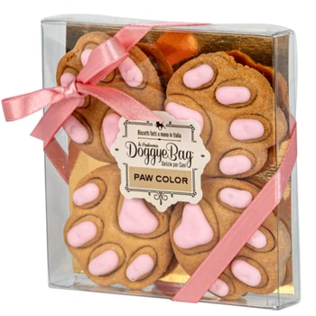 A DoggyeBag Olaszország első kézműves kutyacukrászata, ahol minden falatot szívvel, gondosan válogatott, emberi fogyasztásra is alkalmas alapanyagokból készítenek – kifejezetten a kutyák örömére. A Paw Color egy különleges, mancs formájú keksz, amelyet finom, joghurtos máz borít, pasztellszínű kivitelben. Ropogós állaga és vidám megjelenése tökéletes választássá teszi születésnapra, ajándékba vagy bármilyen alkalomra, amikor egy kis extra kényeztetés jár a kutyusnak. Ez a prémium kutyafalat kézzel készül, kis szériában, hagyományos cukrászati módszerekkel – így minden darab valódi odafigyeléssel és szeretettel készült finomság. Egy különleges keksz különleges pillanatokra.