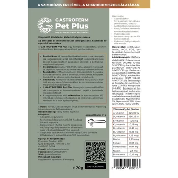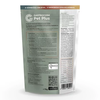 A Gastroferm Pet Plus ízesített, por állagú szimbiotikum (pre- és probiotikum) 5 kg alatti kutyáknak. Mikrokapszulázott élő mikroorganizmusokat, prebiotikumokat, toxinkötőket és vitaminokat tartalmaz; eledelbe keverve könnyen adagolható (1 adagolókanál = 1 g). Mi is ez a termék?A Gastroferm Pet Plus komplex összetételű, természetes alapú pre- és probiotikum készítmény kifejezetten kistestű (5 kg alatti) kutyáknak. A bélflóra egyensúlya nemcsak az emésztésnél fontos: az immunrendszer és az ellenállóképesség egyik alappillére is. Mikor ajánljuk?