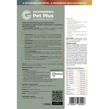 A Gastroferm Pet Plus ízesített, por állagú szimbiotikum (pre- és probiotikum) 5 kg feletti kutyáknak. Mikrokapszulázott élő mikroorganizmusokat, prebiotikumokat, toxinkötőket és vitaminokat tartalmaz; eledelbe keverve könnyen adagolható (1 adagolókanál = 5 g). Mi is ez a termék?A Gastroferm Pet Plus komplex összetételű, természetes alapú pre- és probiotikum készítmény kifejezetten nagytestű (5 kg feletti) kutyáknak. A bélflóra egyensúlya nemcsak az emésztésnél fontos: az immunrendszer és az ellenállóképesség egyik alappillére is. Mikor ajánljuk?