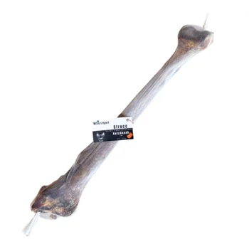 Szárított strucc velős lábszárcsont kutyáknak – természetes, hosszan rágható csontjutalomA szárított strucc velős lábszárcsont egy természetes rágócsont, amely hosszabb rágási élményt és tartós elfoglaltságot ad. A csont velőt tartalmaz, ezért kifejezetten magas az élvezeti értéke, így sok kutya számára motiváló jutalom és rágási elfoglaltság egyszerre. Megfelelő használat mellett különleges, jól tolerálható alternatíva lehet azoknak a gazdiknak, akik természetes csontos rágót keresnek, és szívesen választanak ritkább fehérjeforrásból készült terméket. A strucc csont szerkezete – rágás közben kiszámíthatóbb kopásA strucc csont belső felépítése jellemzően porózusabb, mint sok hagyományos csonté. Rágás közben ez sok esetben azt eredményezi, hogy a csont inkább lassabban kopik, morzsolódik, és kevésbé jellemző rá az éles, szilánkos törés (a kockázat ettől még nem zárható ki teljesen). A lábszárcsont hosszabb, egyenes formája segíthet abban, hogy a kutya stabilan megfogja, és rágás közben könnyebben kontrollálja. Velőtartalom – finom, energiadús, ezért mértékkelA csont természetes velőtartalma miatt kifejezetten ízletes. A velő zsírokat és zsírban oldódó vitaminokat is tartalmaz, ezért ez a rágócsont inkább alkalmi, kontrollált rágásokhoz javasolt. Fontos: