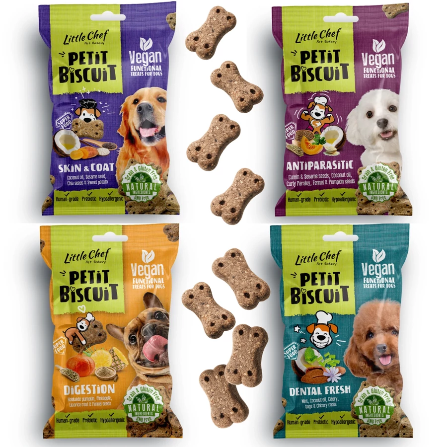 Ez a csomag a Little Chef funkcionális, vegán, gabonamentes kutyasnackjeit gyűjti egybe, hogy több területet is lefedj jutalmazás közben. A falatok kis adagokban, kíméletesen (sütőben) készülnek, kizárólag természetes, emberi fogyasztásra is alkalmas összetevőkből, „szuperélelmiszerekre” építve.