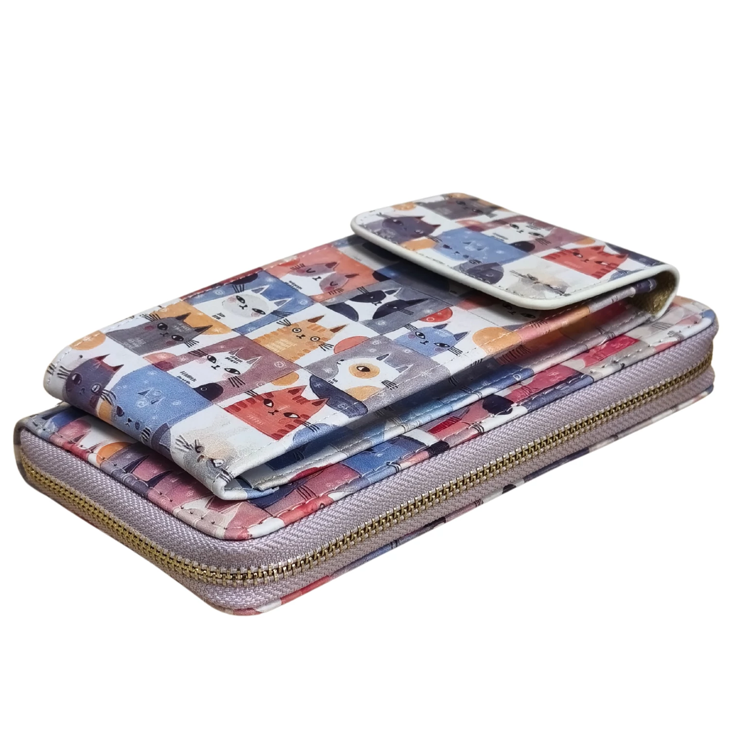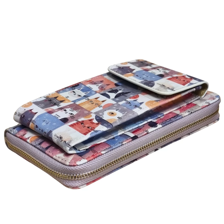 Ez a vidám és egyedi megjelenésű pénztárca tökéletes választás a macskabarátok számára. A pasztell színű, négyzetrácsos elrendezésben megjelenő különböző cicafejek kedves, játékos stílust kölcsönöznek a praktikus kiegészítőnek. A pénztárca, telefontartó és mini táska funkciókat ötvöző darab ideális a mindennapi használatra.