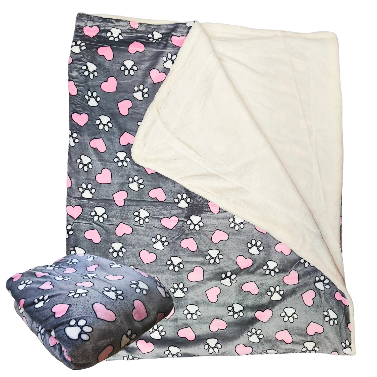 Pihe-puha prémium takaró, amelyet vidám tappancs- és szív minták díszítenek, így nemcsak kényelmes, hanem dekoratív kiegészítője is lehet otthonodnak. A pléd egyik oldala szürke alapon fehér tappancsokkal és rózsaszín szívekkel nyomott mikroplüss anyagból készült, míg a másik oldala meleg, puha báránybunda hatású borítást kapott.