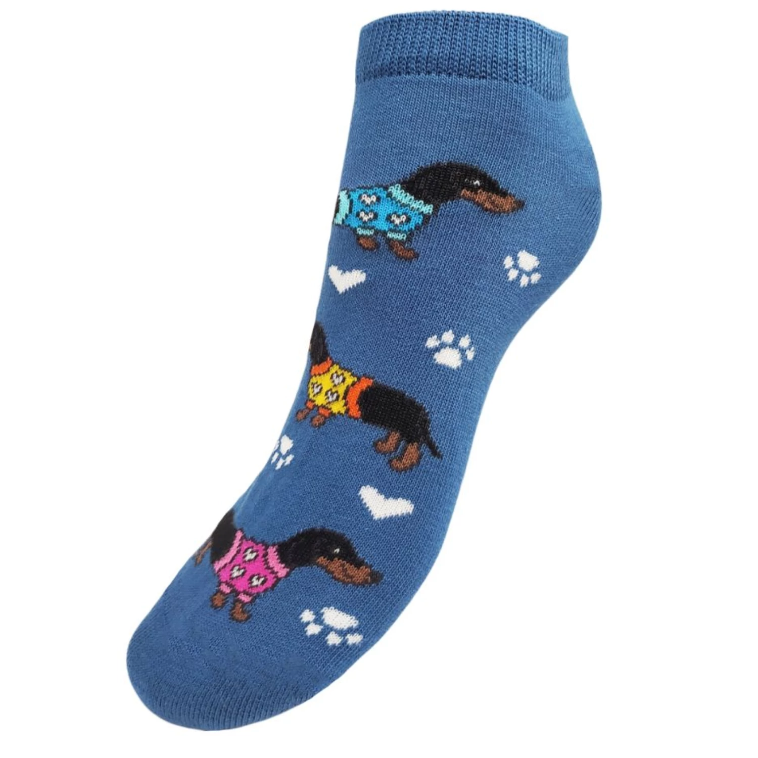 Dobd fel a nyári szettedet egy vidám tacskómintás zoknival! A középkék alapon színes pulcsis tacskók és fehér tappancsok szaladgálnak, hogy minden lépésed stílusos és könnyed legyen.