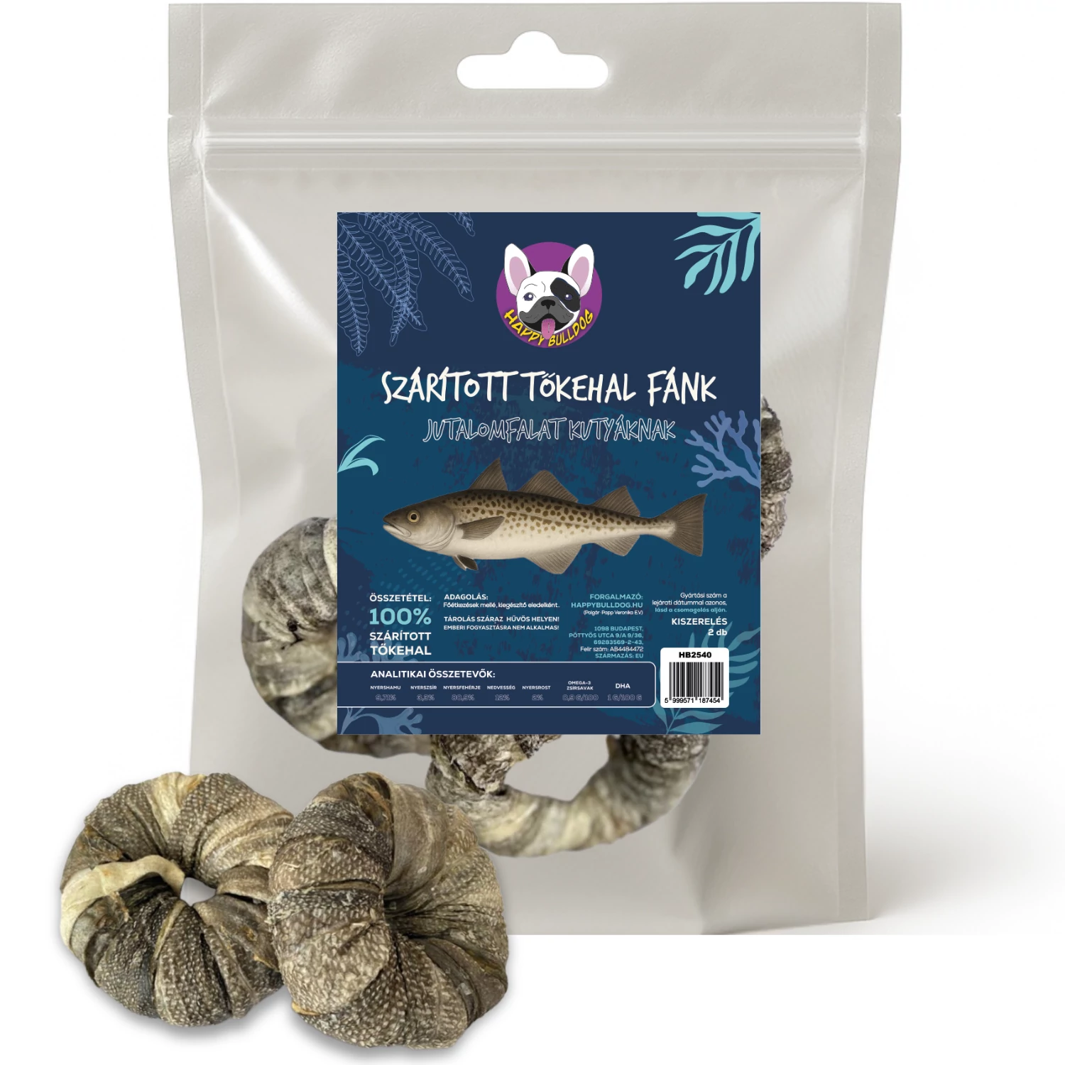 A Happy Bulldog szárított tőkehal fánkja nemcsak jól néz ki, de valóban funkcionális, természetes és egészségtámogató jutalomfalat is. A fánk alak nem csupán látványos, hanem tartós rágási élményt nyújt – a tőkehal pedig az egyik legtisztább, legsoványabb fehérjeforrás, amit kutyád kaphat.