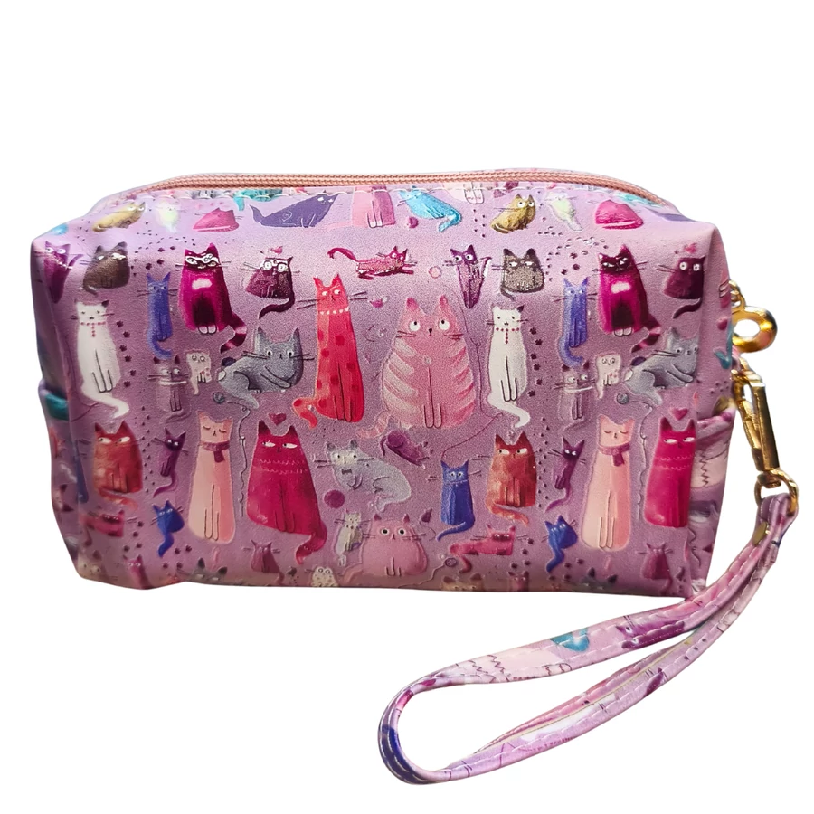 Ez a színes cicás neszesszer pont az a vidám, mégis praktikus darab, amit csak bedobsz a táskádba, és indulhatsz is – akár sétálni a kutyával, akár városba vagy utazáshoz. Elfér benne a smink, a kisebb piperecuccok, kutyás/kutyagazdis apróságok, és a csuklópántnak köszönhetően önálló kis táskaként is megállja a helyét.