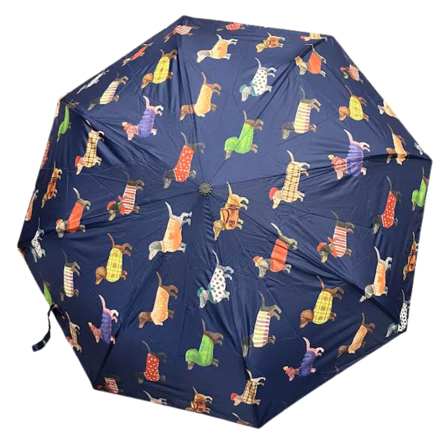 Nem csak az őszi-tavaszi esők, de a nyári záporok és a téli hószitálás idején is jól jön egy ilyen vagány tacskós esernyő! A sötétkék alapon sorakozó, színes kabátkás kutyusok garantáltan mosolyt csalnak mindenki arcára – így nemcsak szárazon, hanem vidáman is megúszod az esőt. Kutyabarátoknak kötelező darab, ajándéknak is szuper ötlet!