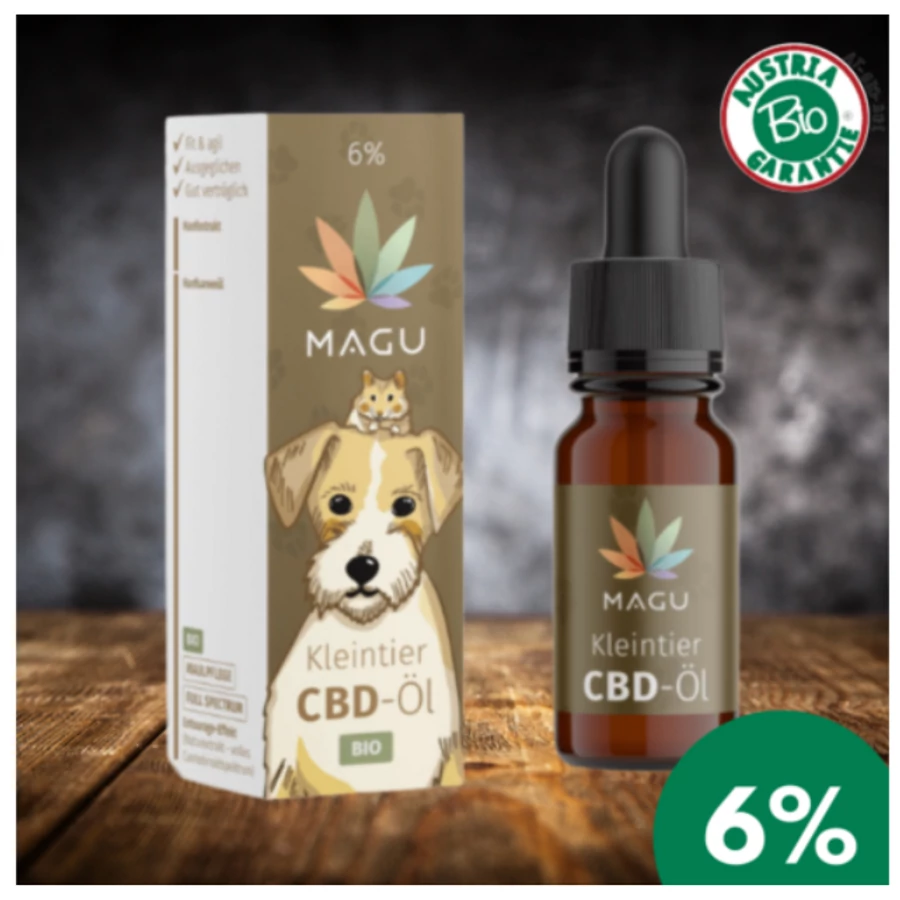 Bio CBD olaj 30 kg alatti kutyáknak, nyulaknak 6%-os CBD tartalommal, full spektrumú. Bizonyítottan is a világ egyik legtisztább, bio minősítéssel rendelkező CBD olaja Ausztriából. 83% hidegen sajtolt bio kendermagolaj, 17% bio kender extraktum, 4% (400 mg) cannabidiol tartalommal. CBD + CBDA + CBG + CBGA + THC (0,13%) hatóanyagokat tartalmaz! Nem pszichoaktív!