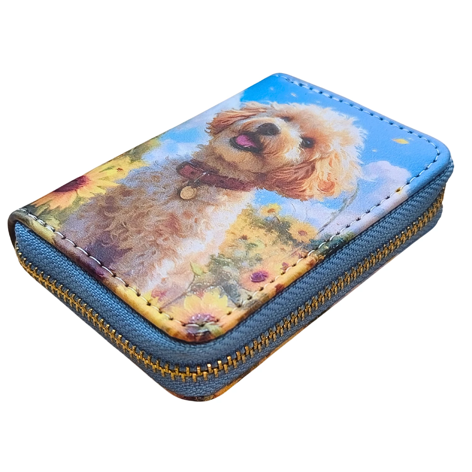 Ez a mesésen kedves pénztárca egy boldogan mosolygó uszkárt ábrázol virágzó napraforgómezőn, ragyogó kék ég alatt. A festményszerű grafika melegséget és életörömöt sugároz – tökéletes választás azoknak, akik szeretik a kutyákat és a természet színeit.