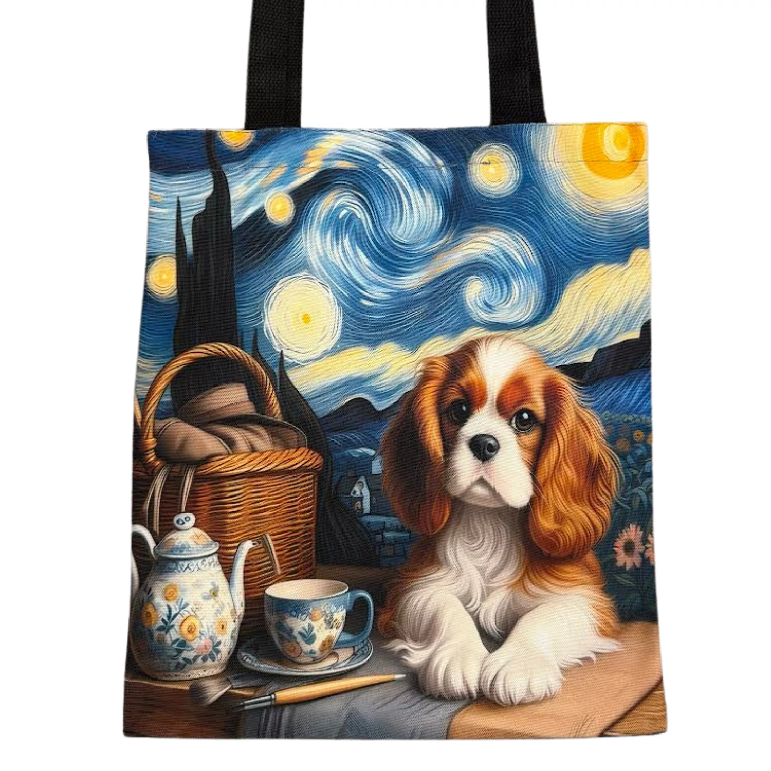 Kifinomult, mégis cuki megjelenés! Ez a vászontáska egy piknikre készülő spánielt ábrázol Van Gogh csillagos égboltja alatt – igazi stílusos választás kutyabarát művészetkedvelőknek! Praktikus, könnyen tisztítható, és minden pillantást magára vonz.